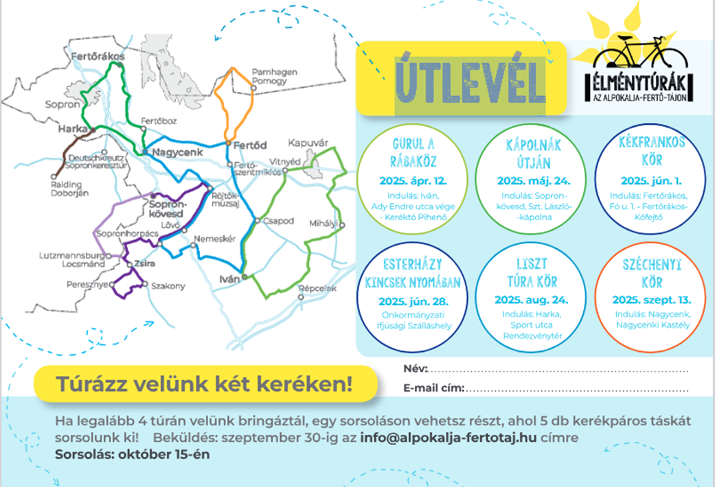 Útvonal: Nagycenk - Ausztria - Und - Sopronhorpács - Lövő - Fertőd - Fertőszéplak - Hegykő - Hidegség - Nagycenk (Lsd. az alábbi térképen a KÉK kört. A térképre kattintva részletes útvonal található, a GPX fájl is letölthetővé válik. Egyéni tekeréshez opcionális program-és szálláslehetőségeket is jelöltünk!)